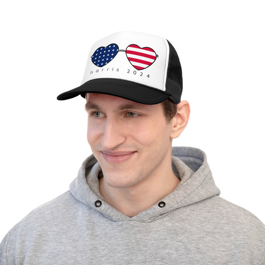 Kamala Harris Trucker Hat - American Flag Hearts Cap