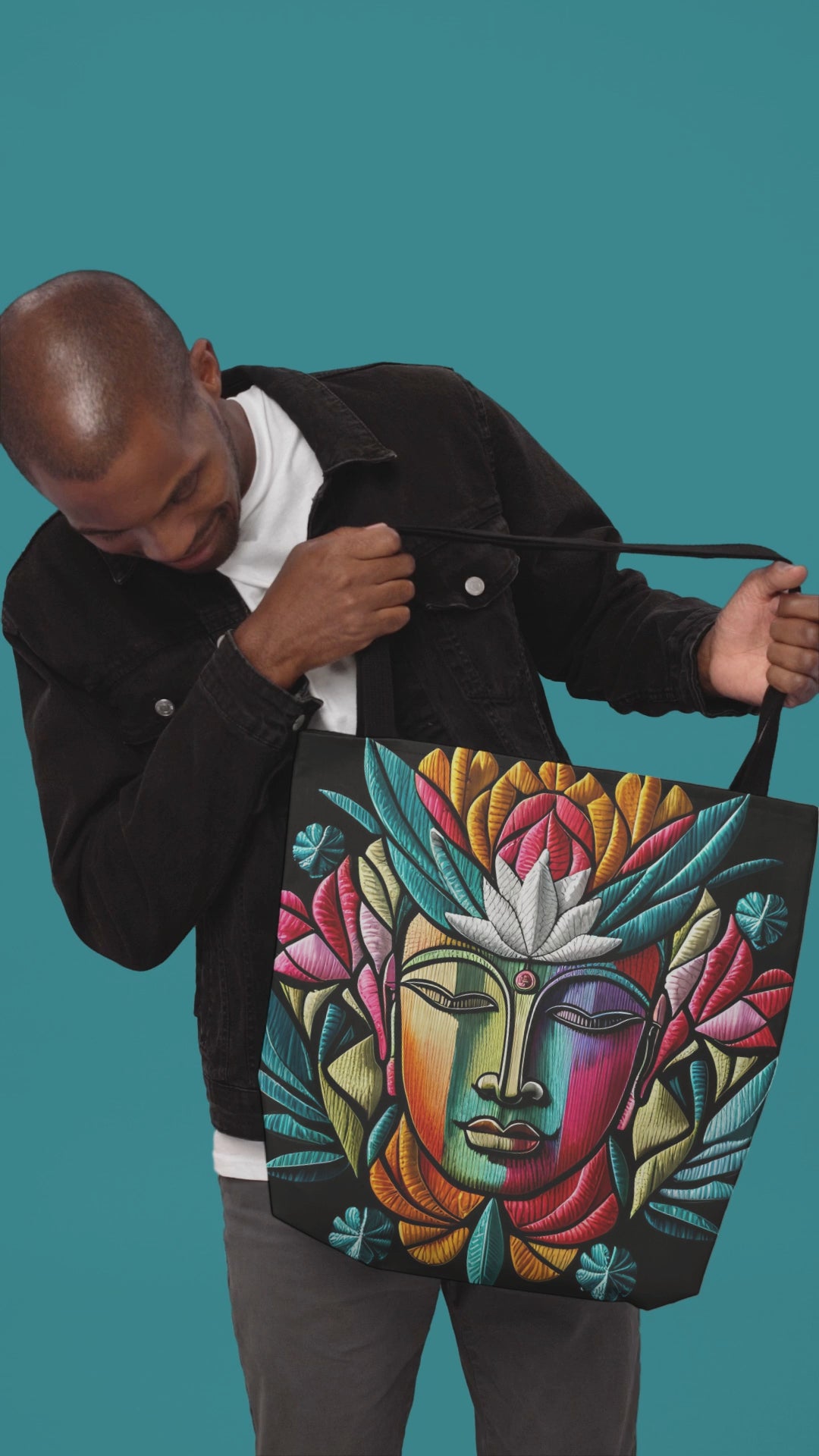 Inspired by embroidered designs and Buddhist art, this Buddha Face Tote is a vibrant print on a reusable, eco-friendly, washable bag.