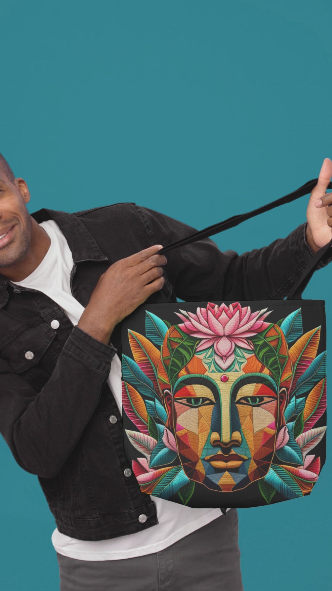 Inspired by embroidered designs and Buddhist art, this Buddha Face Tote is a vibrant print on a reusable, eco-friendly, washable bag.