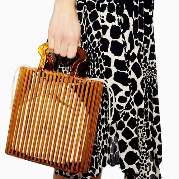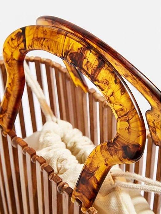 Introducing the Caged Bamboo Tortoiseshell Bag, a striking fusion of natural elegance and modern design. Measuring 9 inches by 9 inches by 3.5 inches, this handbag is crafted from premium bamboo, offering a spacious interior for your essentials. The unique vertical slat design and elegant tortoiseshell handles add a touch of sophistication to any outfit. Ideal for both casual and formal occasions. The interior contains a cotton drawstring removable pouch.